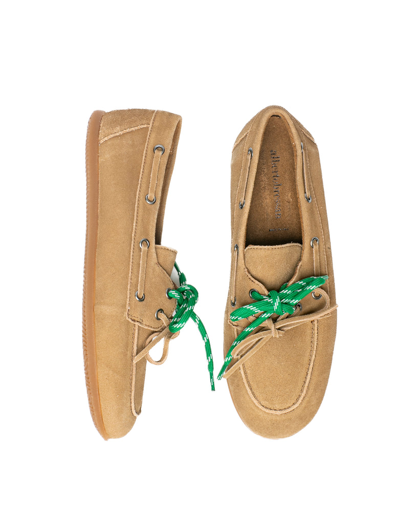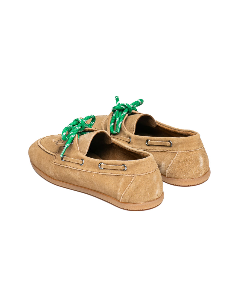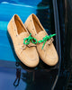 Mocassino in camoscio color cuoio, con suola in gomma antiscivolo, cuciture a vista con lacci passanti laterali.