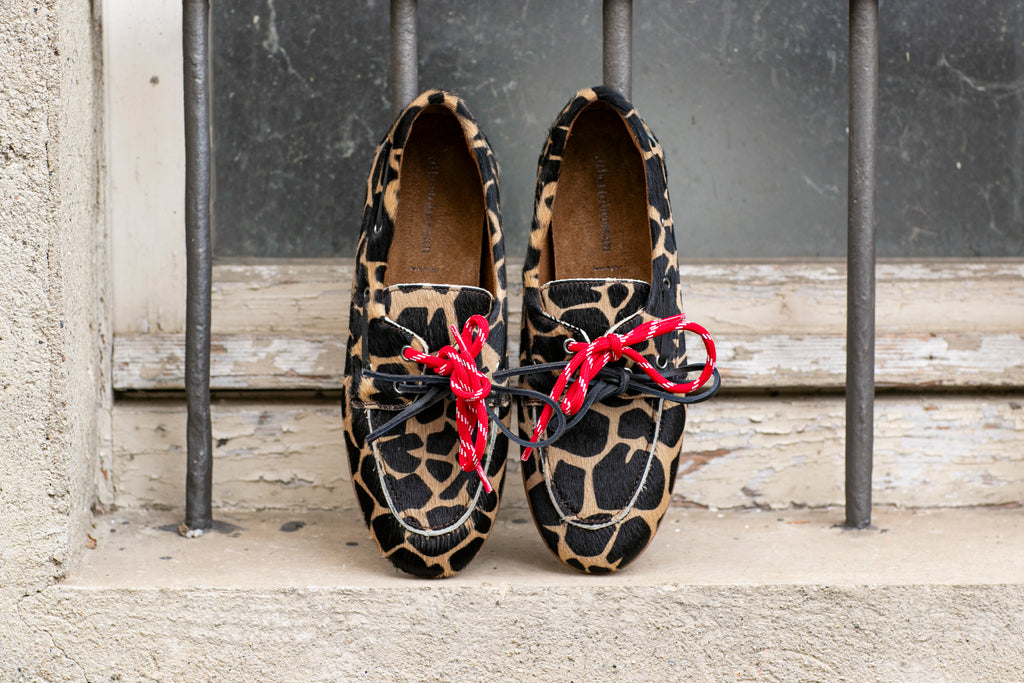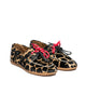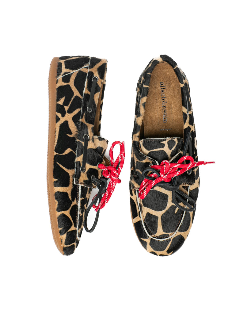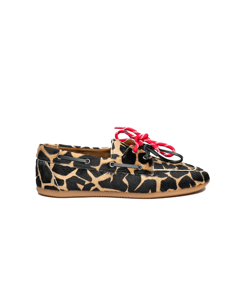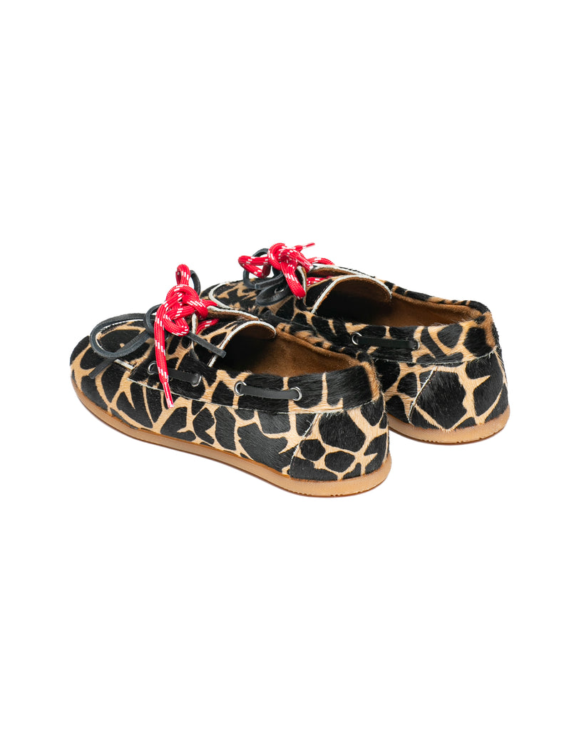 Mocassino in cavallino maculato in stampa giraffa, con suola in gomma antiscivolo, cuciture a vista con lacci passanti laterali.