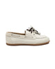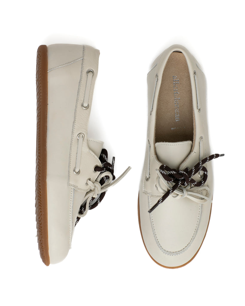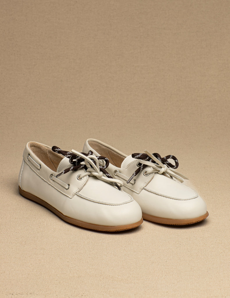 Mocassino in nappa avorio con stringhe nere fantasia . Suola in gomma. Prodotto artigianale italiano. Spedizione gratuita in Italia.