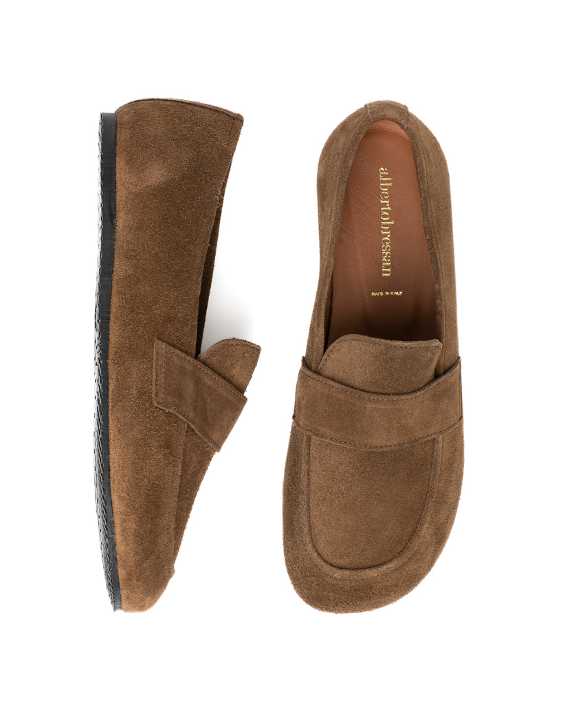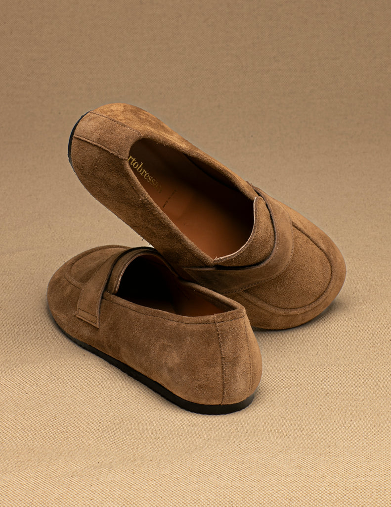Mocassino in camoscio taupe con punta ampia per una calzata rilassata . Suola in gomma. Prodotto artigianale italiano. Spedizione gratuita in Italia.