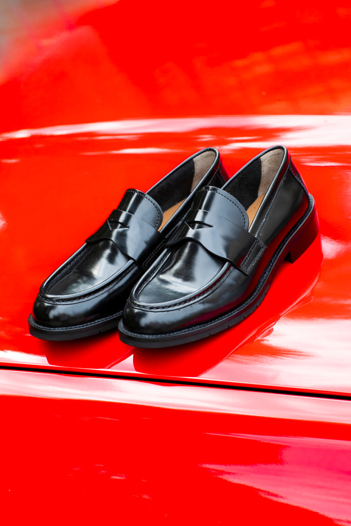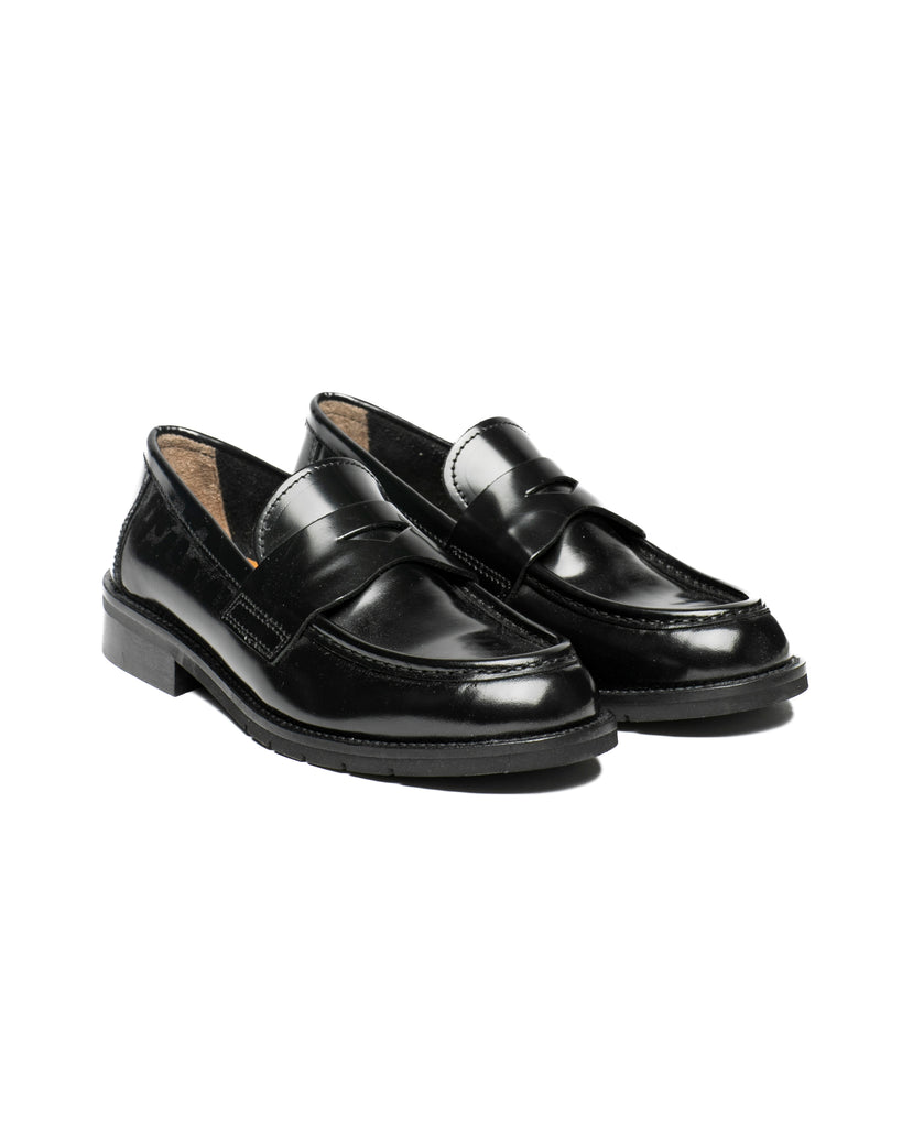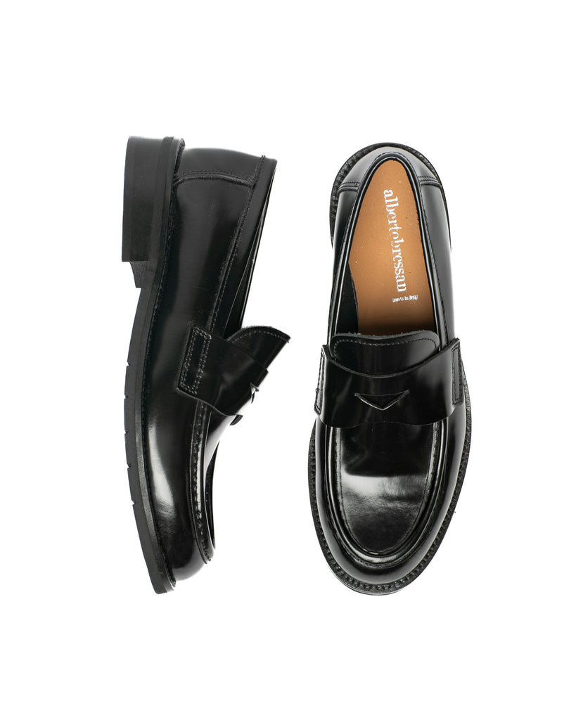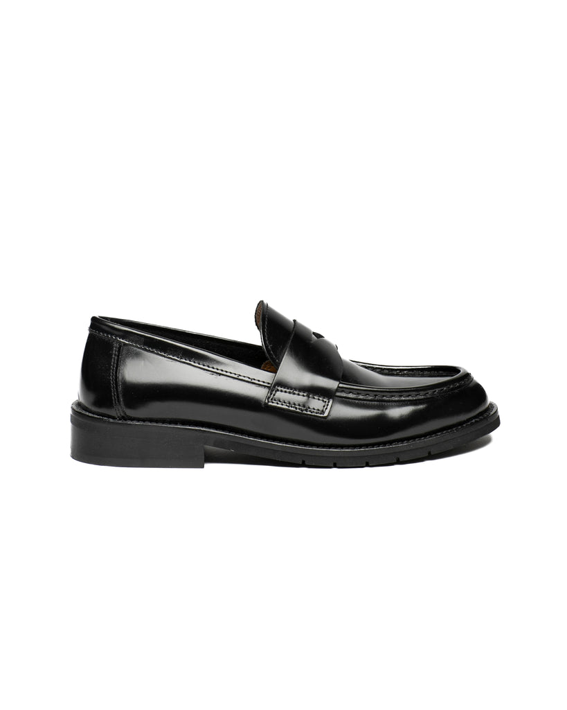 Mocassino college nero in pelle abrasivata lucida con punta tonda.