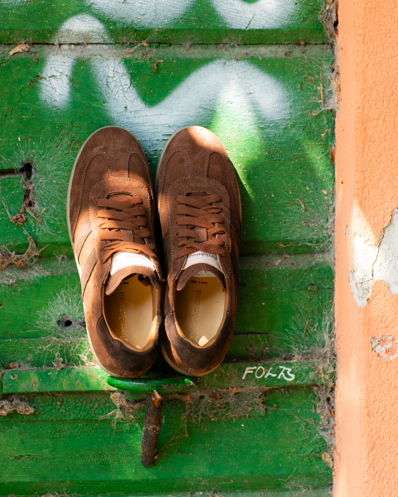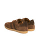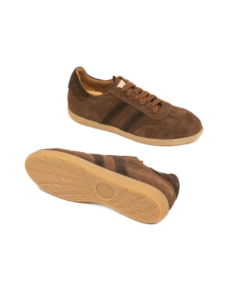 Sneakers realizzate in morbido camoscio color testa di moro, con dettagli in pelle bianca.