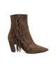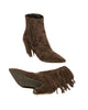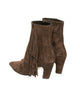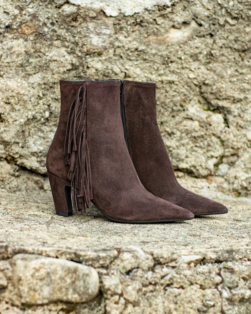 Tronchetto in camoscio testa di moro, a punta, con frange ai lati e zip interna.