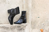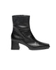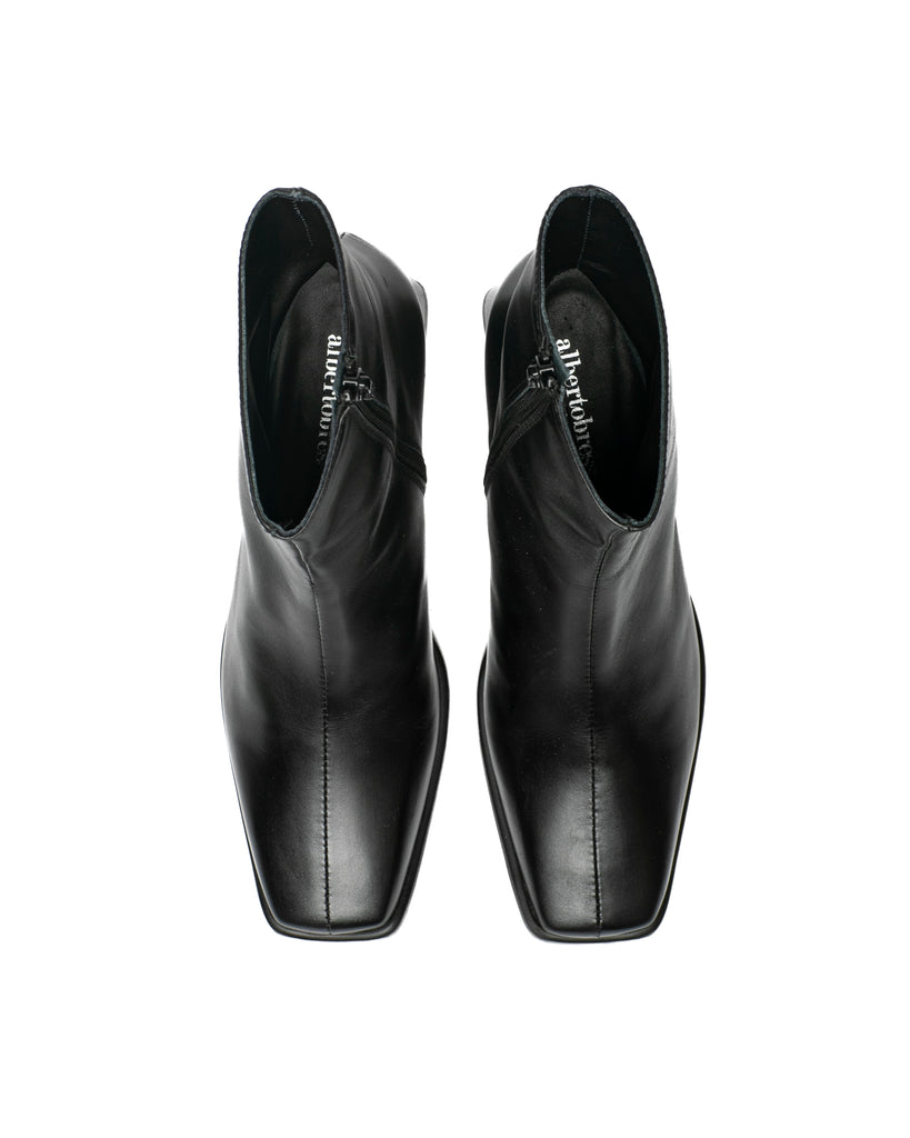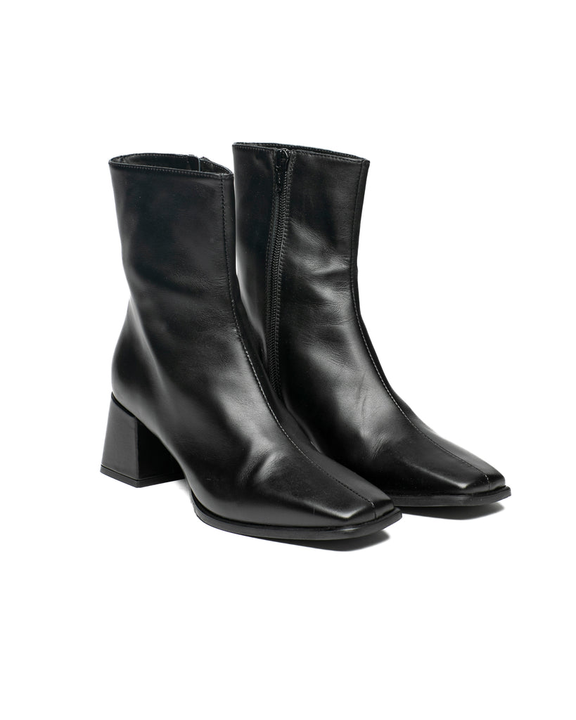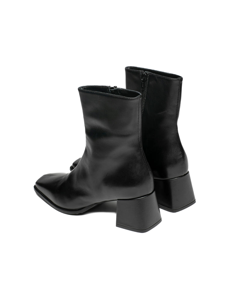 Tronchetto realizzato in morbida nappa nera, punta quadrata, tacco largo medio rivestito, con cerniera laterale per una calzata agevole.