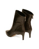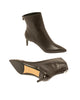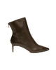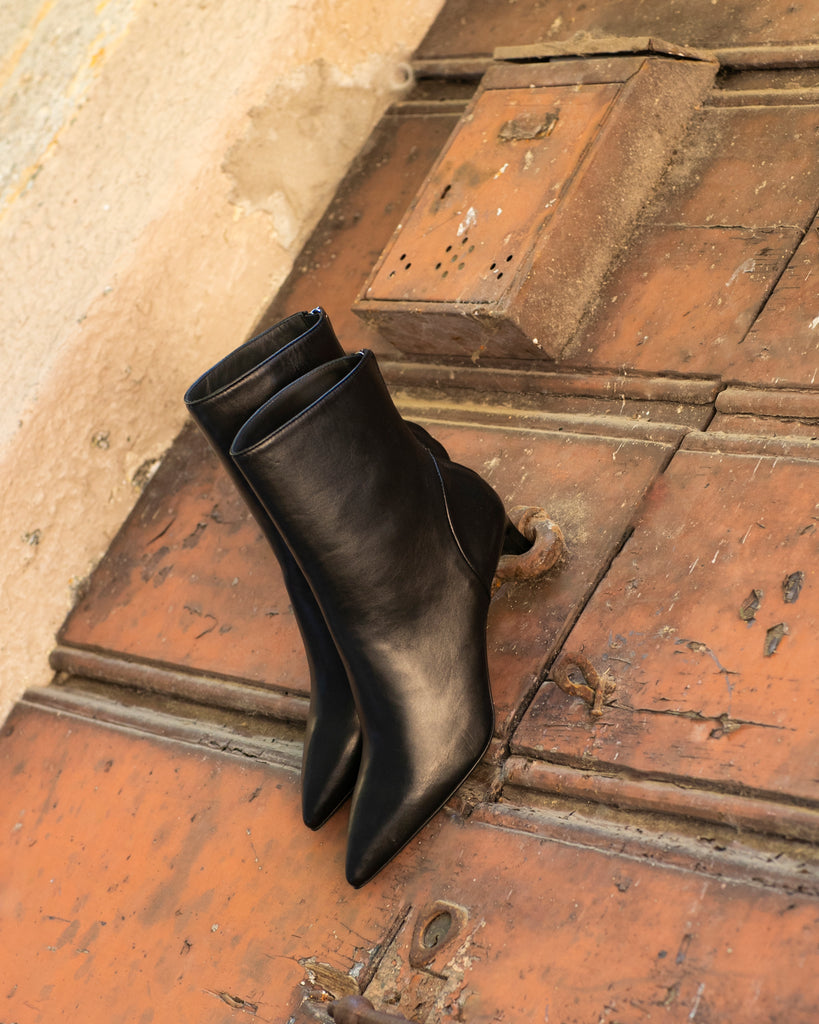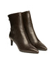 Stivaletto in nappa testa di moro, con tacco sottile, profilo a punta, chiusura con cerniera posteriore.