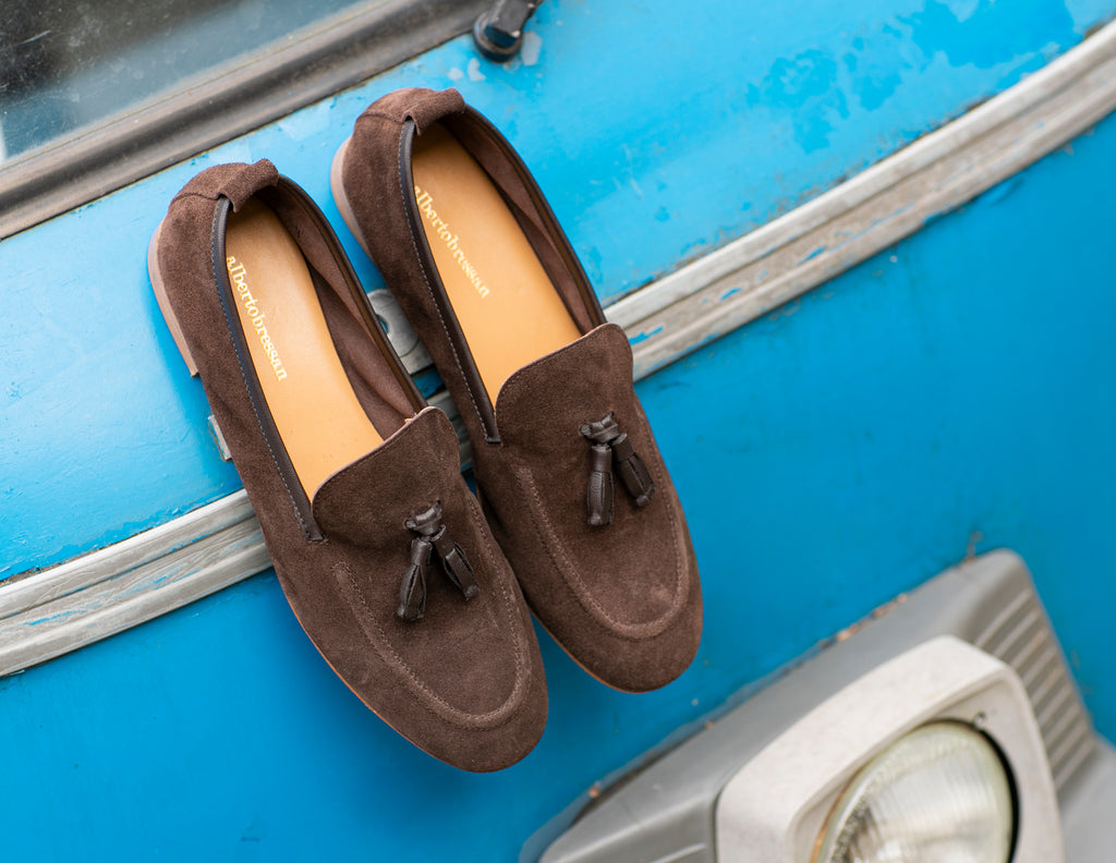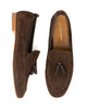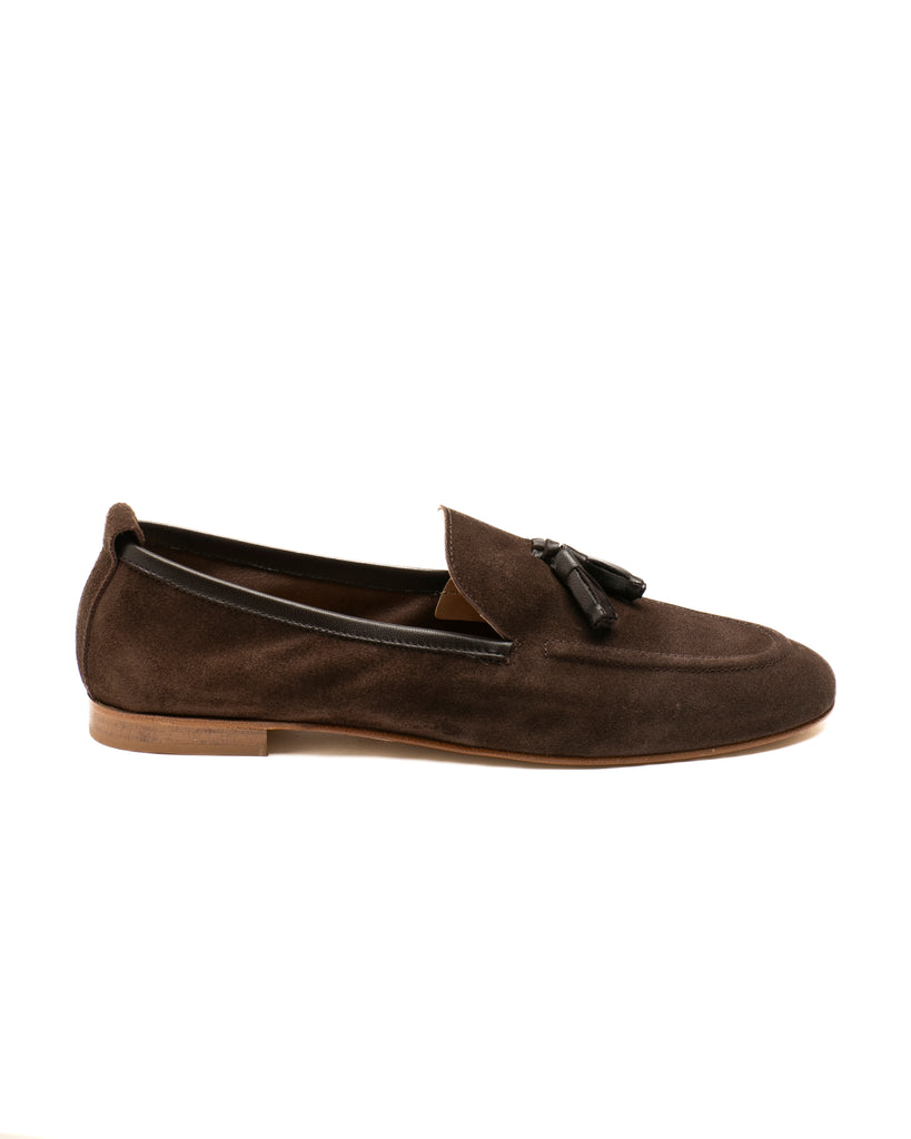 Morbido mocassino in camoscio testa di moro con nappine. Suola in cuoio. Prodotto artigianale italiano. Spedizione gratuita in Italia.
