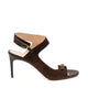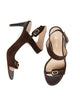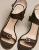 Raffinato sandalo in camoscio testa di moro con tacco 7 cm. Tacco in abs. Suola in cuoio. Prodotto artigianale italiano. Spedizione gratuita in Italia.