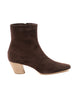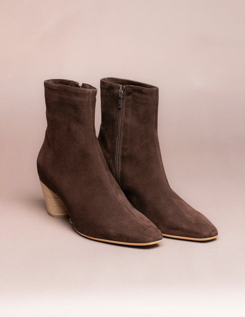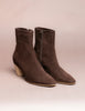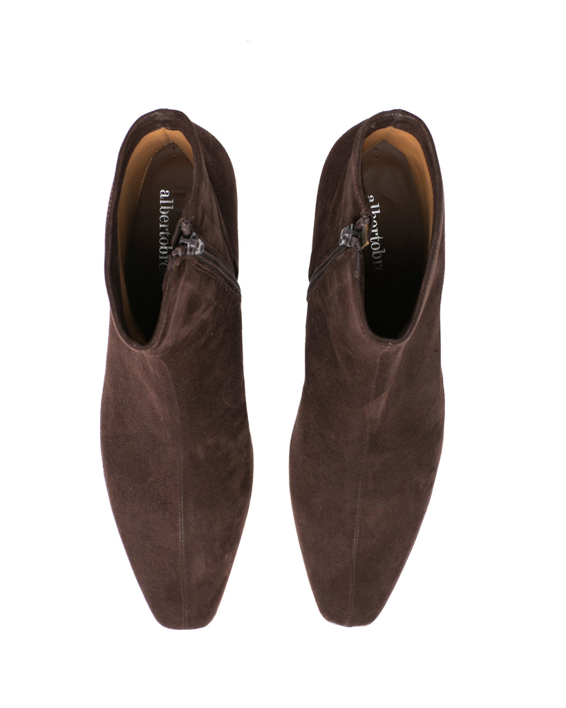 Elegante stivaletto in camoscio testa di moro con zip laterale e tacco chiaro 5 cm. Suola in cuoio. Prodotto artigianale italiano. Spedizione gratuita in Italia.