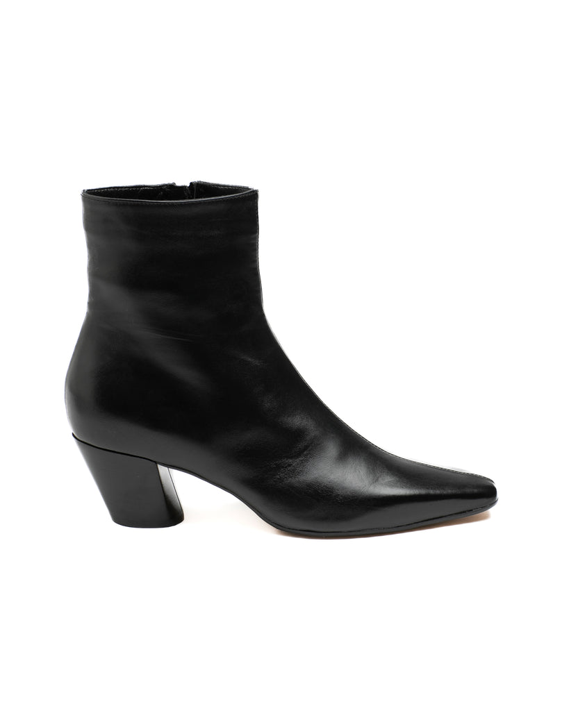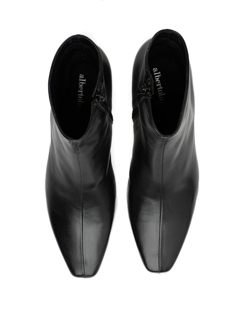 Elegante stivaletto in nappa nero con zip laterale e tacco 5 cm. Suola in cuoio. Prodotto artigianale italiano. Spedizione gratuita in Italia.