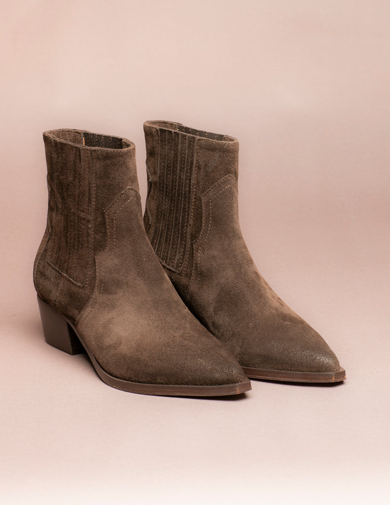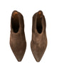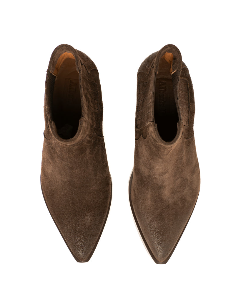 Classico texano basso in camoscio testa di moro dalla forma appuntita con suola in cuoio. Prodotto artigianale italiano. Spedizione gratuita in Italia.