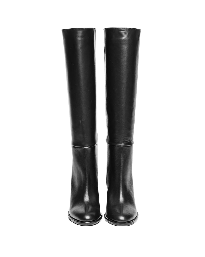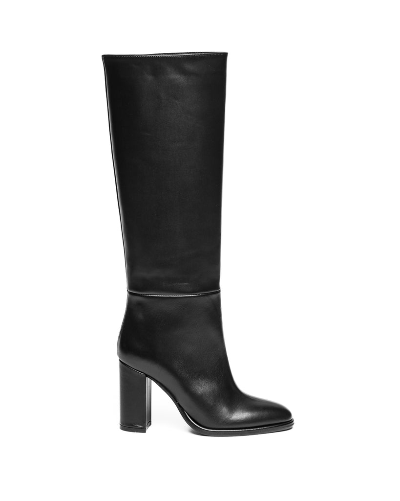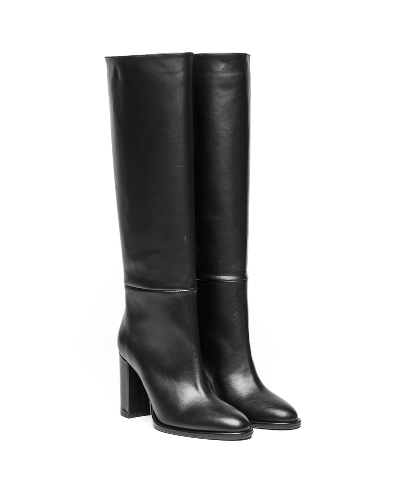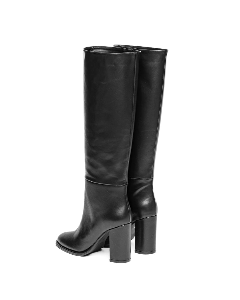 Stivale dal taglio classico in vitello nero, con punta tonda morbida, gambale tubolare, con tacco largo alto.