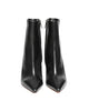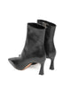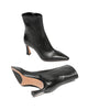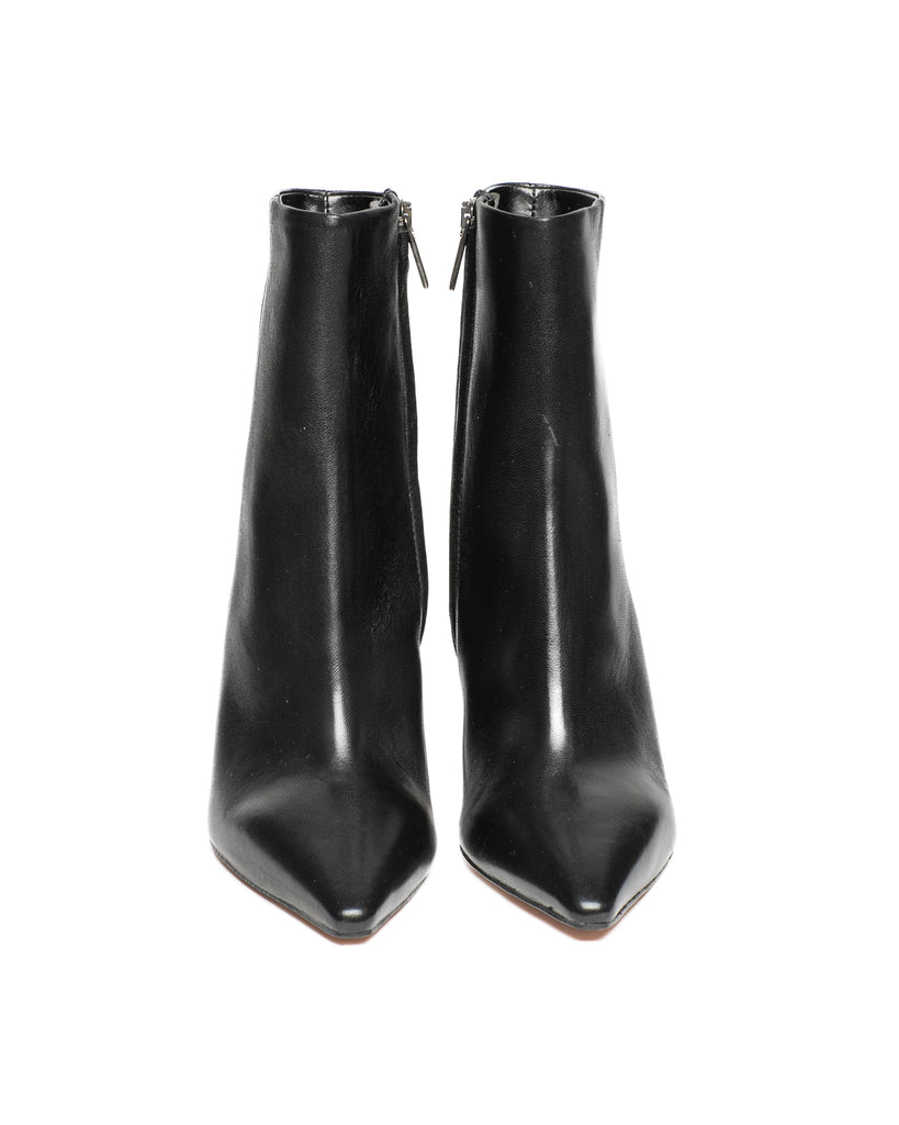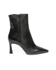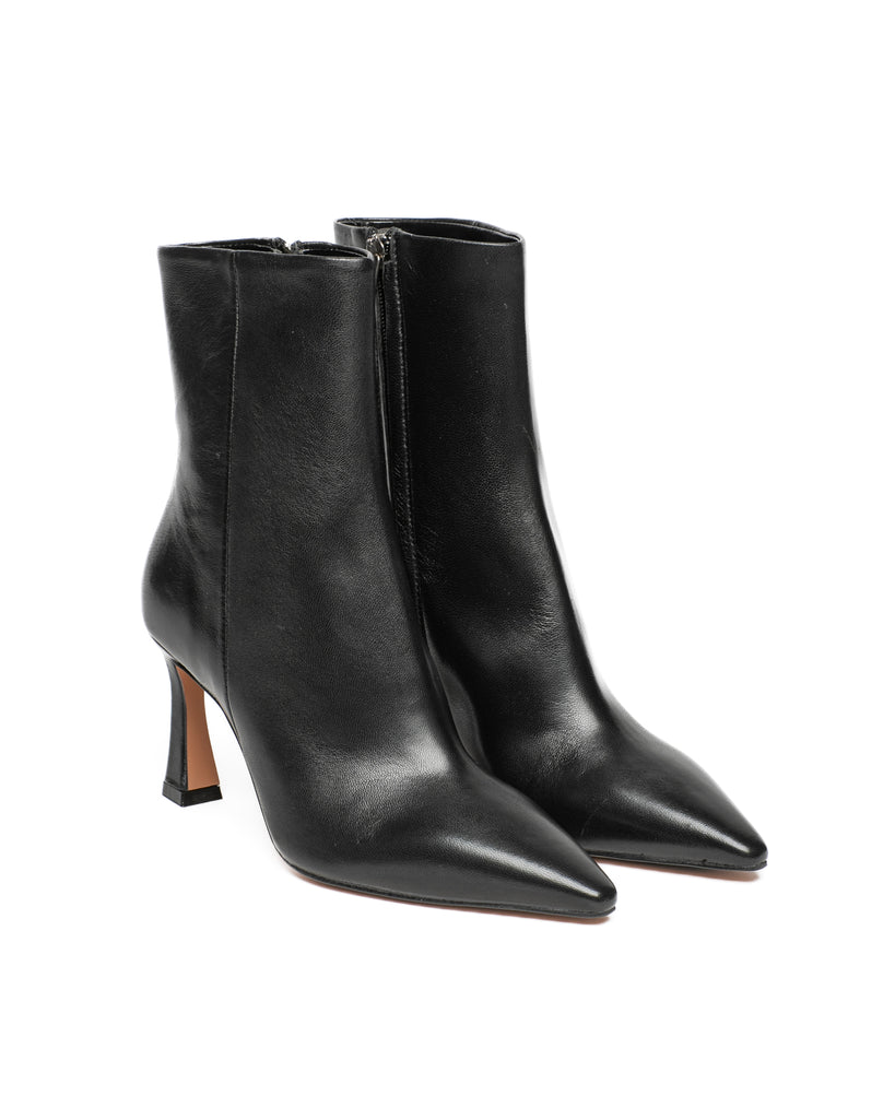 Stivaletto in nappa nero, con tacco a rocchetto, profilo a punta, chiusura con cerniera zip laterale. Suola in cuoio e gomma.